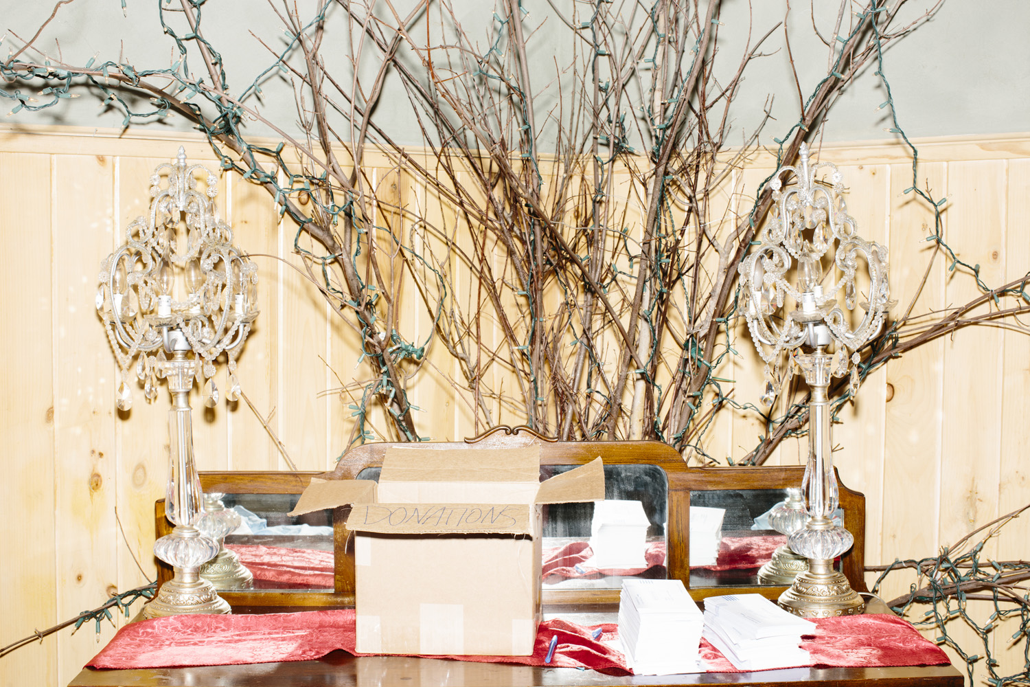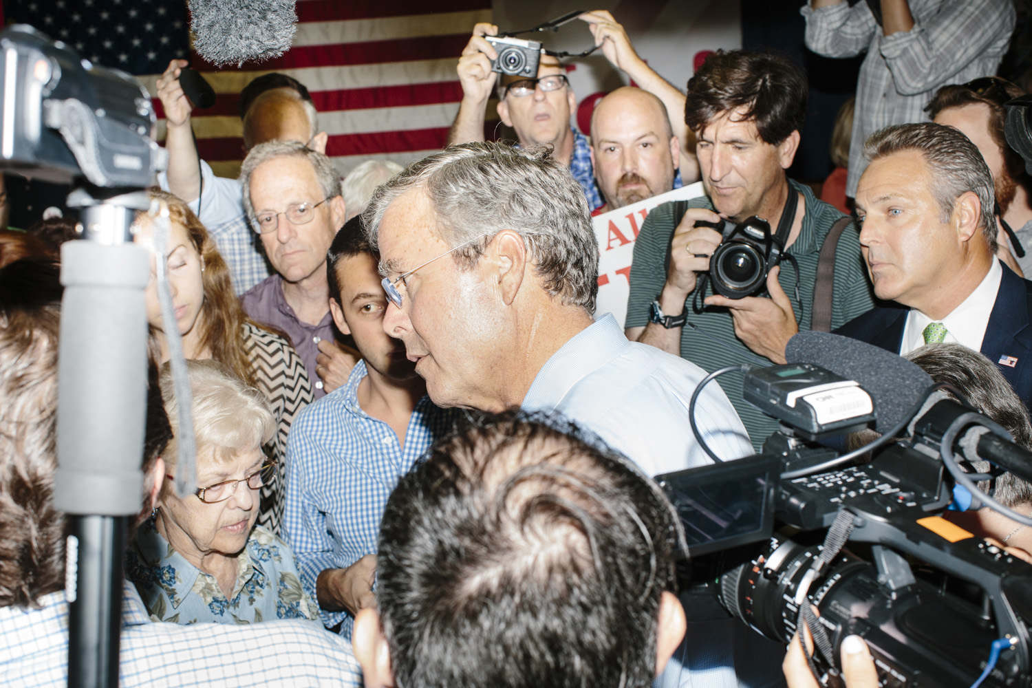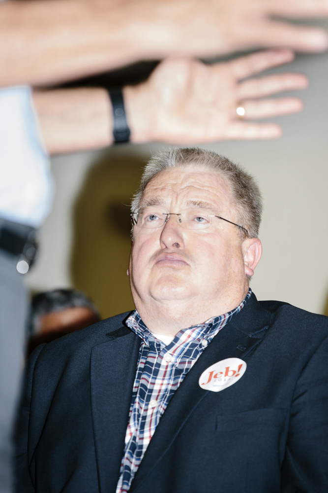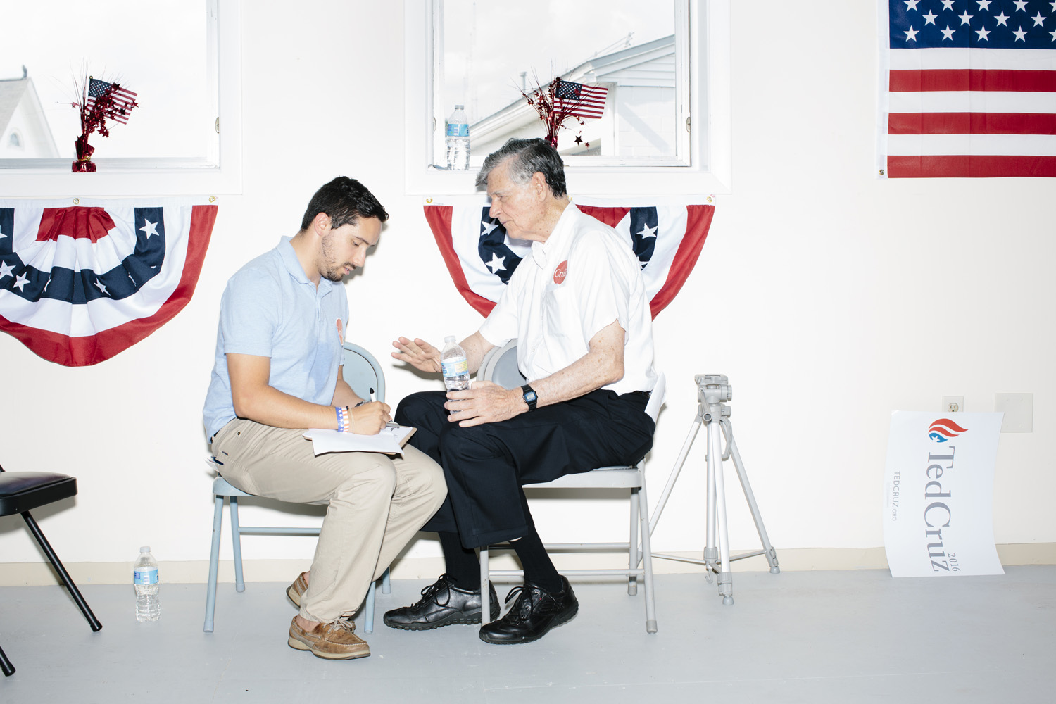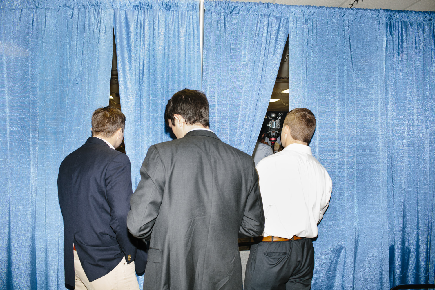 I’ve taken a different approach as I photograph this story, using a harsh and direct flash, evocative of early press photography. The campaigns usually bring in their own lighting and backdrops, and this technique is a deliberate attempt to subvert their control of the optics of politics. Shooting in this way reveals the edges of this political spectacle: cold food left on a buffet line, duct tape holding up the banners, wiring in the corner of the room, bored staffers and journalists, binder clips keeping the American flag in perfect posture. The work is not meant to be critical of any candidates, but rather to focus on the banality of these events as they are set up, performed, and taken down again and again and again.
